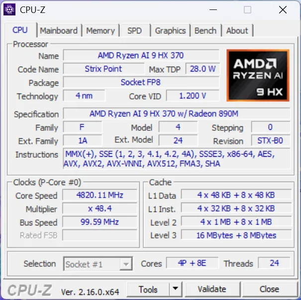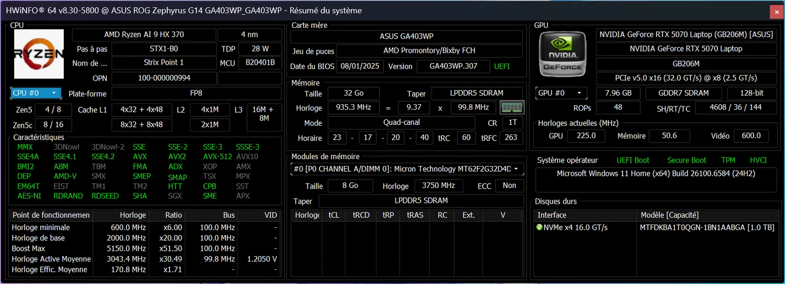 Processeur : AMD Ryzen AI 9 HX 370 (4 P-cores + 8 E-cores + NPU, jusqu’à 5,1 GHz)