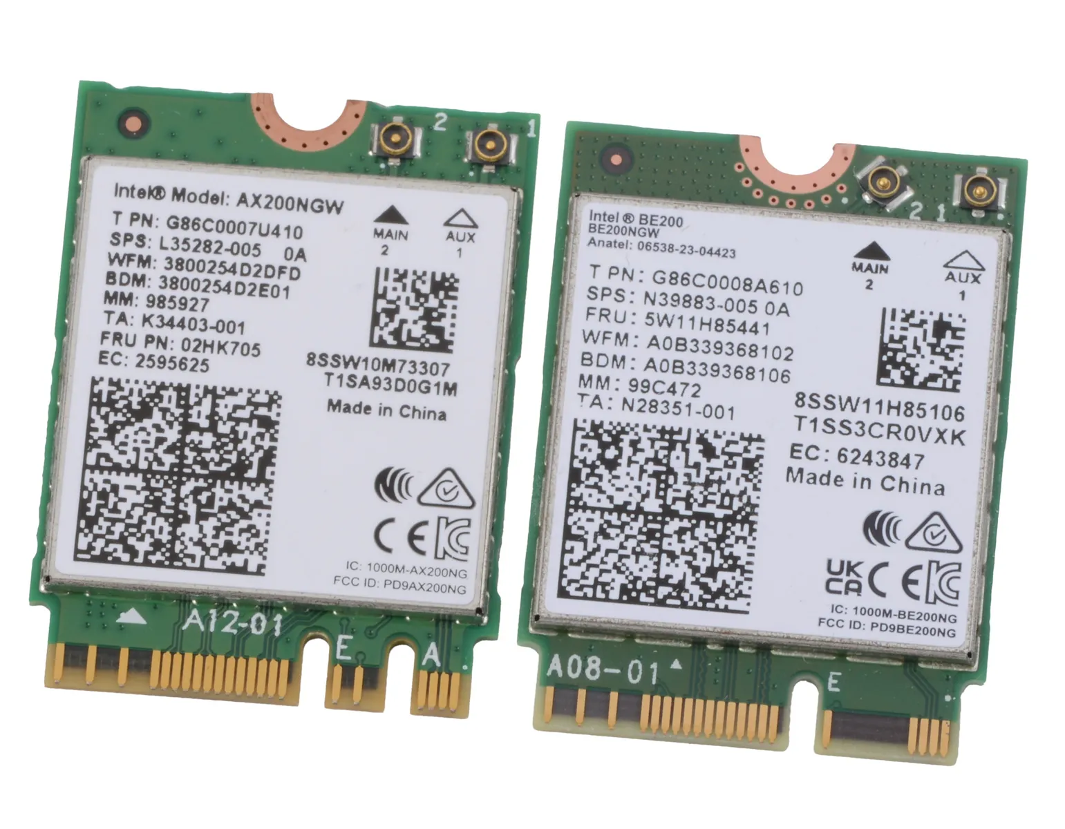 Le saviez-vous ? Toutes les cartes mères qui offrent du Wi-Fi utilisent en fait une petite carte M.2 2230 même si cette dernière est dissimulée sous un carter quelconque. Il est donc permis de la remplacer pour une plus moderne si vous désirez upgrader au Wi-Fi 7 ! Précisons que certaines cartes mères ont un port M.2 pour la carte Wi-Fi avec des clés A + E, c’est-à-dire deux petits ergots servant de détrompeur afin de ne pas insérer un périphérique M.2 incompatible. Les cartes Wi-Fi 7 comme l’Intel BE200 étant exclusivement doté d’une encoche E, elle ne pourra pas s’installer sur un port A + E. Sur nos photos, nous avons mis à jour la carte Wi-Fi d’une Asus ROG Strix B760-F Gaming Wi-Fi, logée dans un petit support en métal lui-même caché sous le plastique autour des prises I/O. Il en va de même pour de nombreux portables, sauf que de plus en plus d’appareils (notamment les plus fins) ont abandonné la carte M.2 amovible pour un contrôleur Wi-Fi soudé. Vous devez donc au préalable trouver cette information sur Internet, par exemple en tapant sur Google le nom de votre laptop suivi de disassambly pour trouver un tutoriel de démontage. Autrefois certains constructeurs avaient aussi une notion de whitelist, c’est-à-dire que seules certaines cartes Wi-Fi étaient acceptées par leur BIOS, mais nous ne sommes plus tombés sur ce genre de pratique depuis quelques années.