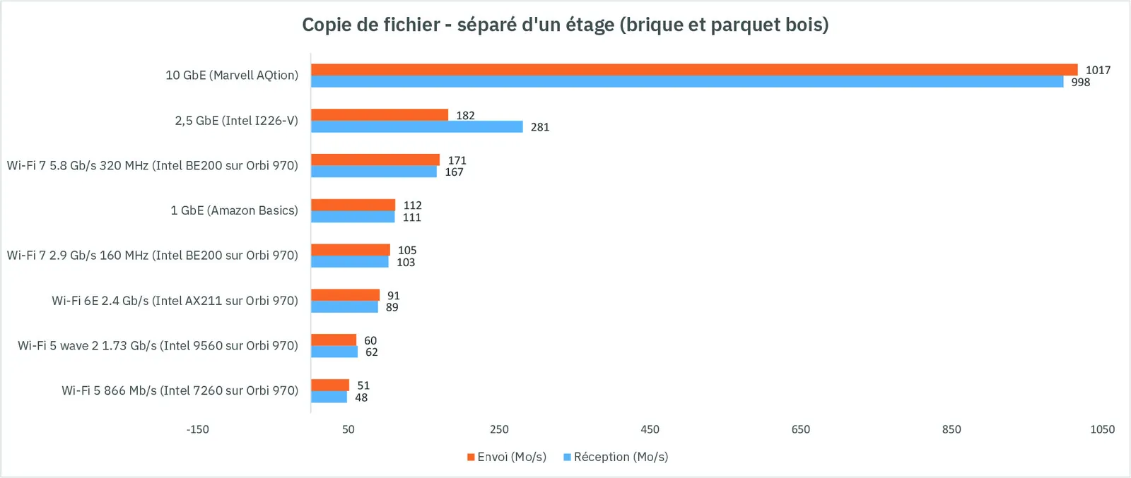 Plutôt que de vous noyer sous des tonnes de graphiques pas forcément faciles à lire, on préfère vous synthétiser nos longues journées de test. À commencer par ce qui excite les geeks qui en veulent toujours plus, les débits maximums à courte portée (moins de 5 mètres). On a réussi à se connecter en 5,8 Gb/s (précisément 5764 Mb/s) avec les trois contrôleurs, c’est-à-dire ceux d’Intel, de Qualcomm et de Mediatek, tant sur le routeur Orbi 970 que sur l’Asus ROG Rapture GT-BE19000. À la fois en réception et en émission. Pour autant, les résultats obtenus ne sont pas identiques ! C’est avec la carte Intel BE200 qu’on a obtenu les performances à la fois les plus élevées et les plus consistantes. En l’occurrence, on affiche 3,74 Gb/s (467 Mo/s) dans iPerf3 et on copie des fichiers via l’explorateur de Windows a 3,15 Gb/s (394 Mo/s) de moyenne. C’est plus du double des 170 à 180 Mo/s auxquels nous sommes habitués en Wi-Fi 6, sacré score ! Avec la carte Qualcomm en revanche iPerf se contente de 3,15 Gb/s (394 Mo/s) et on ne peut même pas vous dire avec la Mediatek car à part durant notre essai initial il n’a plus été possible d’accrocher les 5767 Mb/s de lien avec les deux routeurs. À propos de 5767 Mb/s, bien que MLO fût activé (par défaut sur le Netgear Orbi, après activation manuelle sur l’Asus Rapture GT-BE19000) et que la présence des deux bandes de fréquences 5 + 6 GHz fût confirmée par Windows dans les propriétés de connexion, on n’est jamais parvenu à obtenir 8647 Mb/s. C’est dommage. 394 Mo/s en copie de gros fichiers, c’est franchement impressionnant pour du sans-fil. C’est sensiblement plus que les 275 Mo/s qu’on atteint en Ethernet 2,5 Gb/s ! Et au sujet du ping, en local, on relève 2 ms alors qu’on a 4 et 5 ms en Wi-Fi 6 sur notre Livebox 7. C’est très bon dans les deux cas, mais ça reste loin de l’Ethernet qui tourne en dessous de la milliseconde. Cet écart de quelques millisecondes entre Wi-Fi 6 et 7 on le retrouve dans Speedtest qui affiche autour de 15 ms en Wi-Fi 7 et 20 ms en Wi-Fi 6. On a aussi essayé sous GeForce Now, la plateforme de streaming de jeu où le ping a un réel impact et on obtient 2 ms de mieux en Wi-Fi 7 qu’en Wi-Fi 6 (14 ms au lieu de 16 ms), mais c’est toujours plus qu’en Ethernet (11 ms). Au-delà des 2 ms de gagné, signalons surtout que le WiFi 7 offre une latence plus stable, il y a beaucoup moins de pics de latence qu’auparavant et ça c’est bien pour les joueurs. En interdisant les canaux de 320 MHz, qui ont peu de chance d’être utilisables dans un environnement urbain congestionné, on relève quand même 197 Mo/s (c’est pile la moitié, ce qui est surprenant même si c’est aussi logique). C’est donc un peu mieux là aussi qu’en Wi-Fi 6 ou on relève dans les mêmes conditions 173 Mo/s. Quand on s’éloigne, le comportement est similaire à celui du Wi-Fi 6. La portée n’est pas améliorée, nos murs de pierre ne sont toujours pas franchis d’ailleurs. En revanche on constate toujours les gains liés à l’adoption de nouvelles technologies Wi-Fi 7 comme le 4K QAM. Par exemple un SpeedTest, sur notre connexion fibre de 2 Gbs on passe de 1170 Mb/s à 1340 Mb/s. Un gain qui se retrouve aussi sur nos divers essais sur smartphone, que ce soit à courte portée (moins de 5 m) ou à une distance plus grande. On s’est aperçu, un peu trop tard hélas, que nous n’avions pas réalisé la moindre mesure de consommation. La Wi-Fi Alliance indique que cette dernière est en baisse, même si on est en droit de se demander si c’est vrai avec le MLO actif.