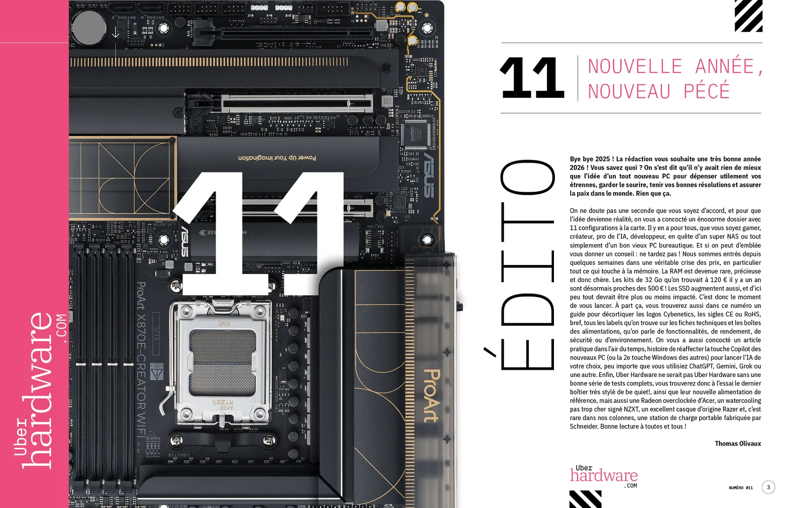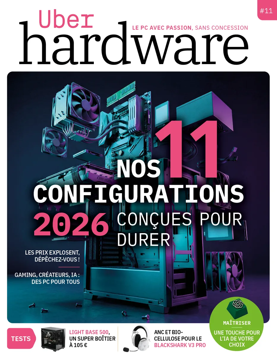 Rien que ça. On ne doute pas une seconde que vous soyez d’accord, et pour que l’idée devienne réalité, on vous a concocté un énooorme dossier avec 11 configurations à la carte. Il y en a pour tous, que vous soyez gamer, créateur, pro de l’IA, développeur, en quête d’un super NAS ou tout simplement d’un bon vieux PC bureautique. Et si on peut d’emblée vous donner un conseil : ne tardez pas ! Nous sommes entrés depuis quelques semaines dans une véritable crise des prix, en particulier tout ce qui touche à la mémoire. La RAM est devenue rare, précieuse et donc chère. Les kits de 32 Go qu’on trouvait à 120 € il y a un an sont désormais proches des 500 € ! Les SSD augmentent aussi, et d’ici peu tout devrait être plus ou moins impacté. C’est donc le moment de vous lancer. À part ça, vous trouverez aussi dans ce numéro un guide pour décortiquer les logos Cybenetics, les sigles CE ou RoHS, bref, tous les labels qu’on trouve sur les fiches techniques et les boîtes des alimentations, qu’on parle de fonctionnalités, de rendement, de sécurité ou d’environnement. On vous a aussi concocté un article pratique dans l’air du temps, histoire de réaffecter la touche Copilot des nouveaux PC (ou la 2e touche Windows des autres) pour lancer l’IA de votre choix, peu importe que vous utilisiez ChatGPT, Gemini, Grok ou une autre. Enfin, Uber Hardware ne serait pas Uber Hardware sans une bonne série de tests complets, vous trouverez donc à l’essai le dernier boîtier très stylé de be quiet!, ainsi que leur nouvelle alimentation de référence, mais aussi une Radeon overclockée d’Acer, un watercooling pas trop cher signé NZXT, un excellent casque d’origine Razer et, c’est rare dans nos colonnes, une station de charge portable fabriquée par Schneider. Bonne lecture à toutes et tous !