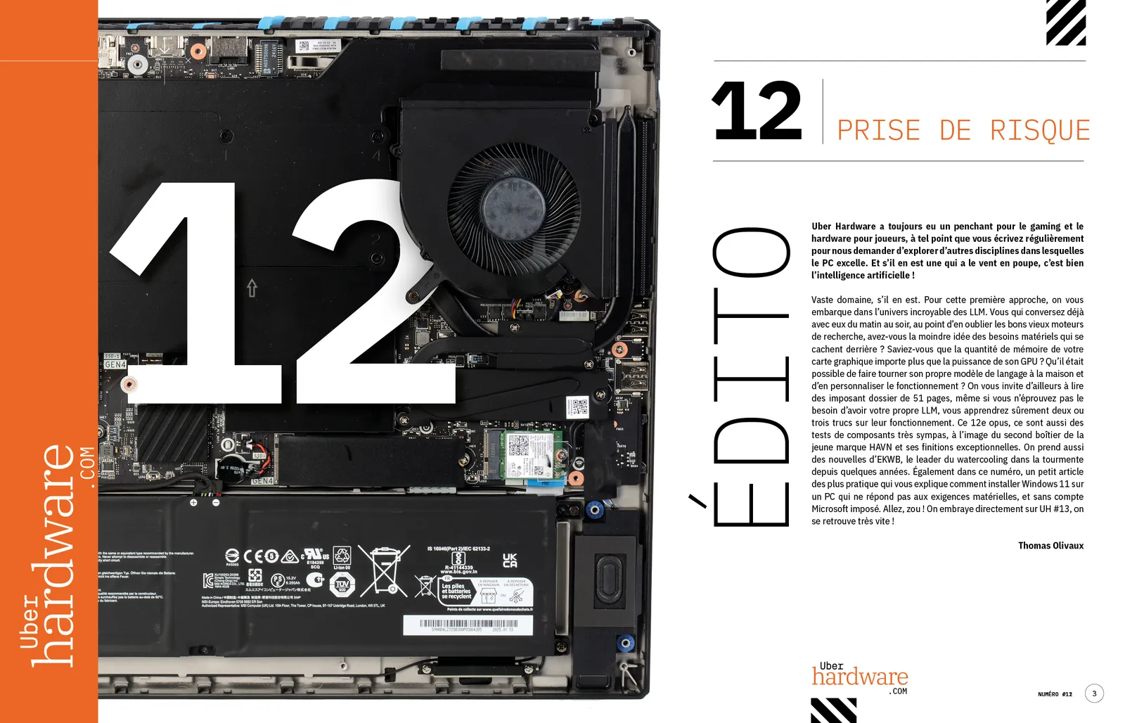 Vaste domaine, s’il en est. Pour cette première approche, on vous embarque dans l’univers incroyable des LLM. Vous qui conversez déjà avec eux du matin au soir, au point d’en oublier les bons vieux moteurs de recherche, avez-vous la moindre idée des besoins matériels qui se cachent derrière ? Saviez-vous que la quantité de mémoire de votre carte graphique importe plus que la puissance de son GPU ? Qu’il était possible de faire tourner son propre modèle de langage à la maison et d’en personnaliser le fonctionnement ? On vous invite d’ailleurs à lire des imposant dossier de 51 pages, même si vous n’éprouvez pas le besoin d’avoir votre propre LLM, vous apprendrez sûrement deux ou trois trucs sur leur fonctionnement. Ce 12e opus, ce sont aussi des tests de composants très sympas, à l’image du second boîtier de la jeune marque HAVN et ses finitions exceptionnelles. On prend aussi des nouvelles d’EKWB, le leader du watercooling dans la tourmente depuis quelques années. Également dans ce numéro, un petit article des plus pratique qui vous explique comment installer Windows 11 sur un PC qui ne répond pas aux exigences matérielles, et sans compte Microsoft imposé. Allez, zou ! On embraye directement sur UH #13, on se retrouve très vite !