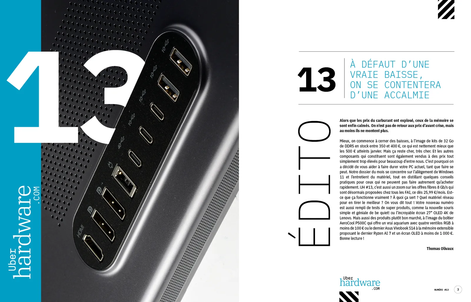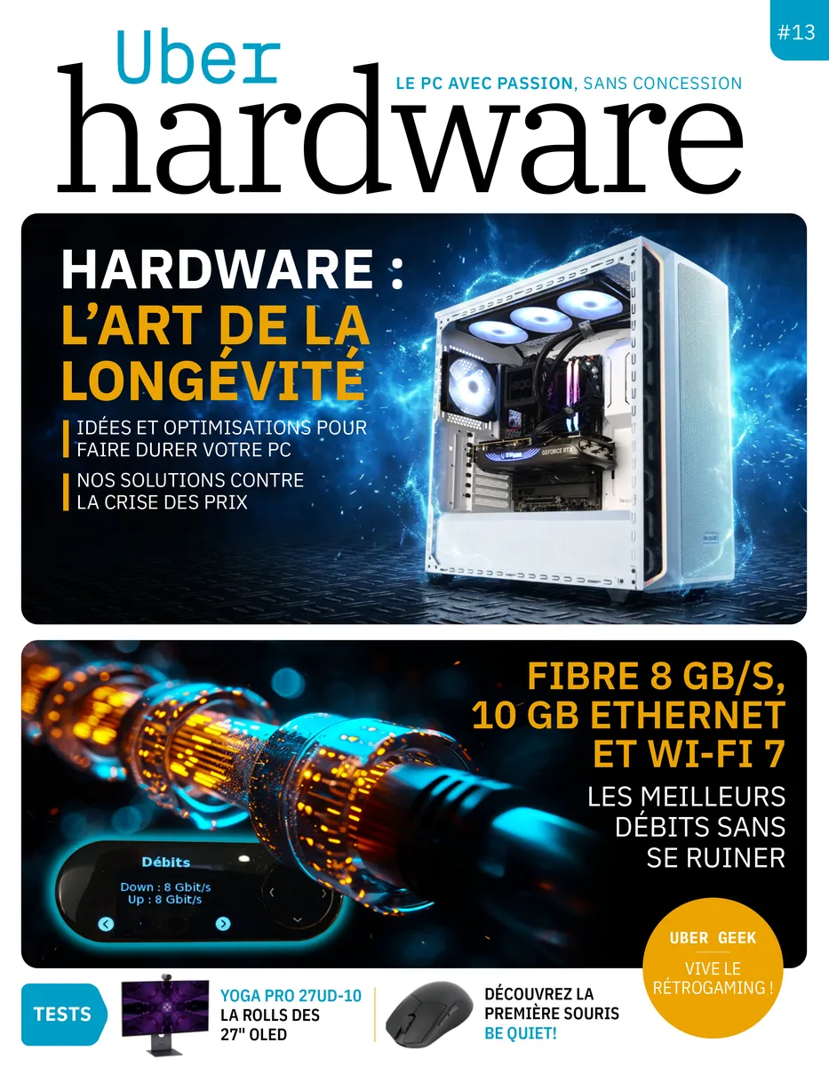 Mieux, on commence à cerner des baisses, à l’image de kits de 32 Go de DDR5 en stock entre 350 et 400 €, ce qui est nettement mieux que les 500 € atteints janvier. Mais ça reste cher, très cher. Et les autres composants qui constituent sont également vendus à des prix tout simplement trop élevés pour beaucoup d’entre nous. C’est pourquoi on a décidé de vous aider à faire durer votre PC actuel, tant que faire se peut. Notre dossier du mois se concentre sur l’allègement de Windows 11 et l’entretient du matériel, tout en distillant quelques conseils pratiques pour ceux qui ne peuvent pas faire autrement qu’acheter rapidement. UH #13, c’est aussi un zoom sur les offres fibres 8 Gb/s qui sont désormais proposées chez tous les FAI, ce dès 25,99 €/mois. Est-ce que ça fonctionne vraiment ? À quoi ça sert ? Quel matériel réseau pour en tirer le meilleur ? On vous dit tout ! Votre nouveau numéro est aussi rempli de tests de super produits, comme la nouvelle souris simple et géniale de be quiet! ou l’incroyable écran 27″ OLED 4K de Lenovo. Mais aussi des produits plutôt bon marché, à l’image du boîtier AeroCool P500C qui offre un vrai aquarium avec quatre ventilos RGB à moins de 100 € ou le dernier Asus Vivobook S14 à la mémoire extensible proposant le dernier Ryzen AI 7 et un écran OLED à moins de 1 000 €. Bonne lecture !